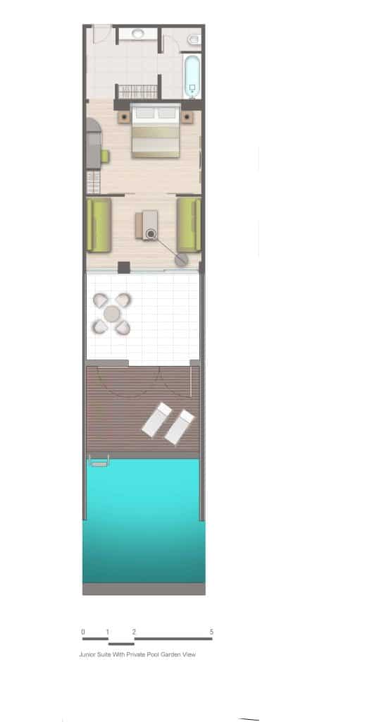 Depuis les chambres joliment aménagées, vous accédez à une terrasse meublée avec vue sur le jardin et à une piscine privée (3,98 m x 4,0 m x 1,2 m de profondeur) dotée d'une zone séparée pour plus de sécurité et d'intimité. Comprend deux pièces séparées : une chambre à coucher avec un lit double, avec une porte coulissante ouvrant sur un salon spacieux avec deux canapés-lits simples. Salle de bains avec baignoire.